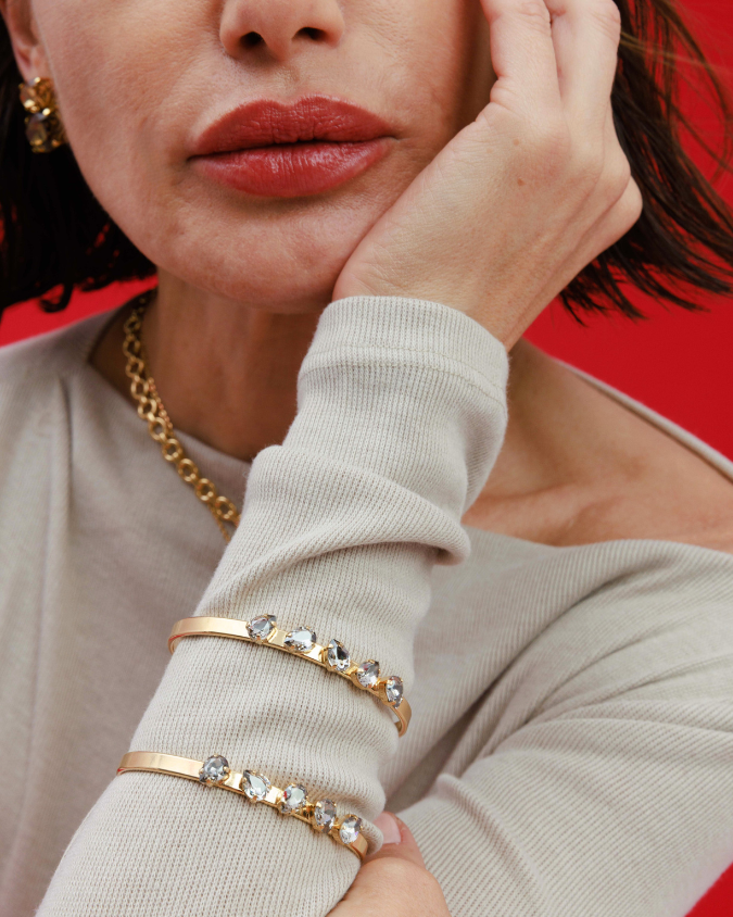 Woman wearing gold jewelry including a necklace, bracelet, and ring against a red background