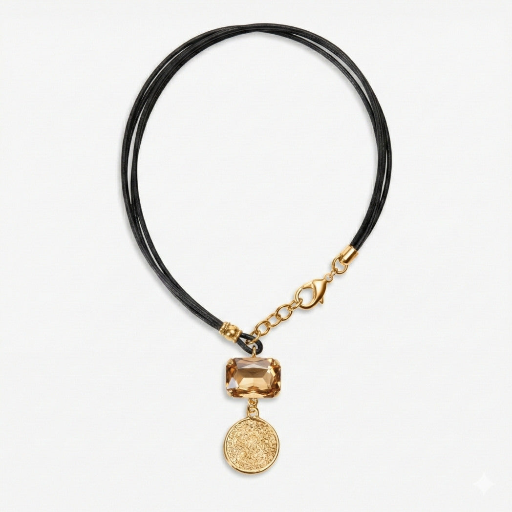 Woman wearing gold earrings and a pendant necklace with a black cord.