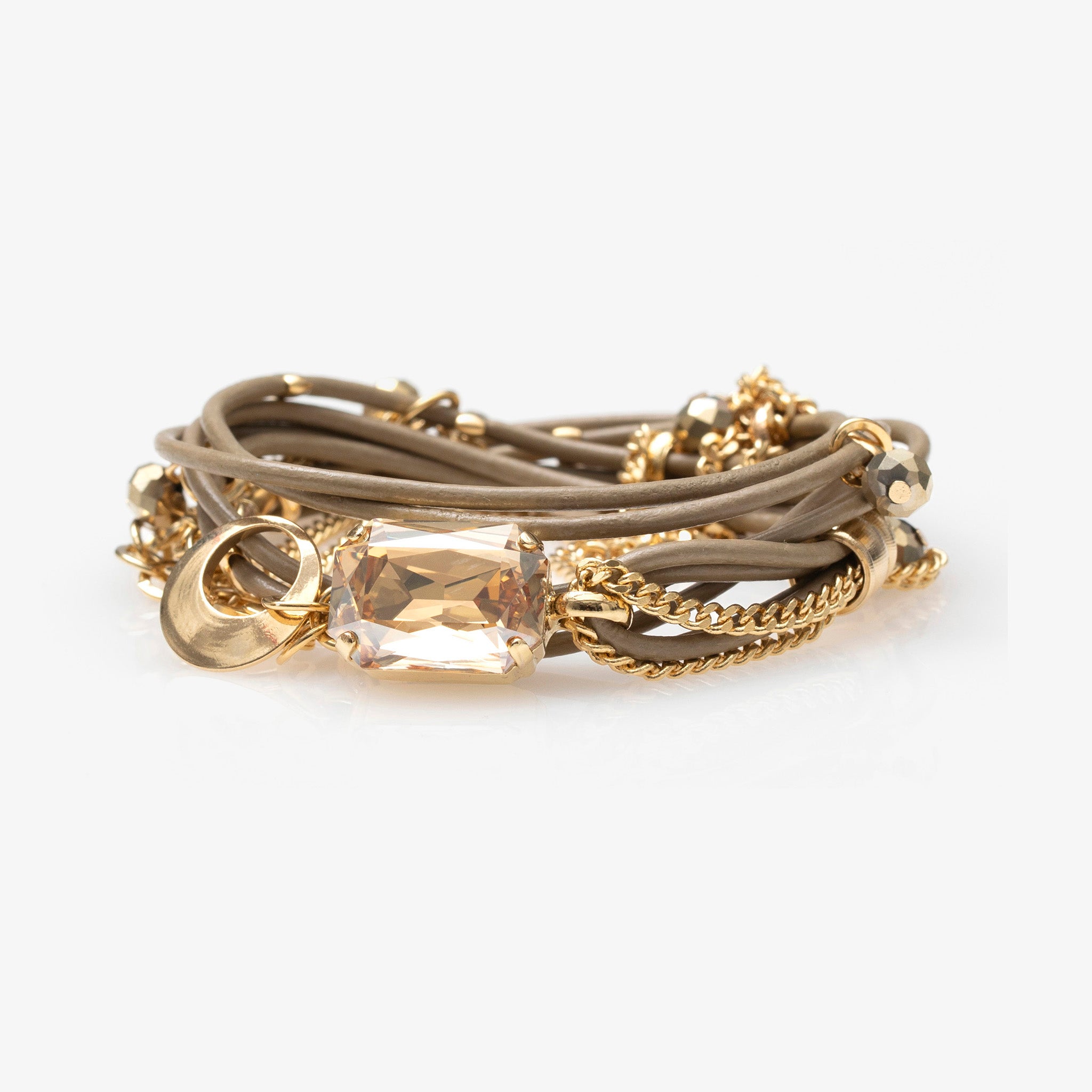 Close-up of a hand wearing a decorative bracelet with crystals and leather straps.